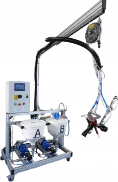 Impianto che permette di dosare, miscelare e applicare resine A 2 COMPONENTI tramite una pistola erogatrice manuale.