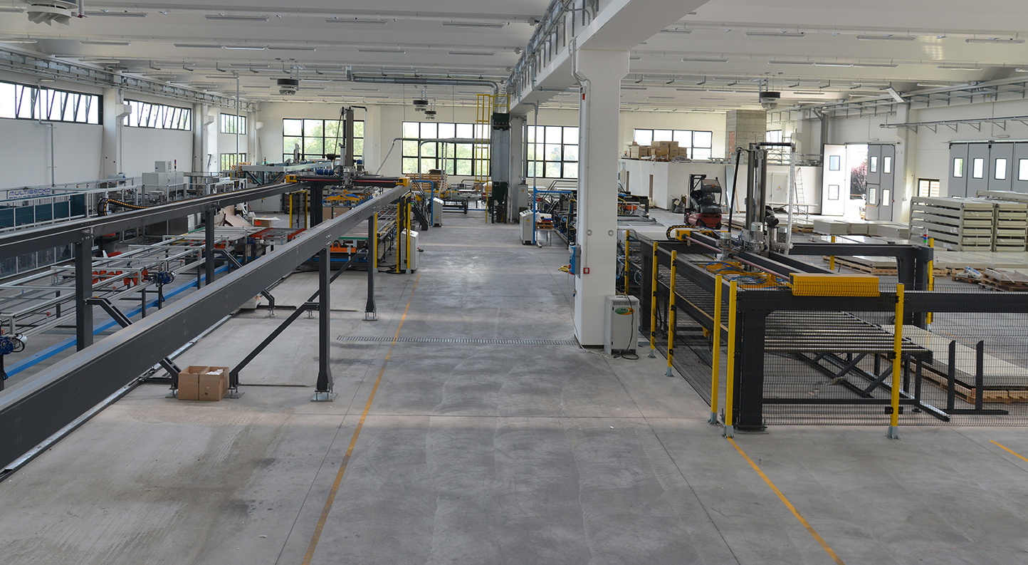 Linea di taglio e bisellatura per grandi formati, dal caricamento alla lavorazione. L'impianto totalmente automatico taglia e rifinisce le lastre di grande formato in piastrelle di diverse dimensioni.